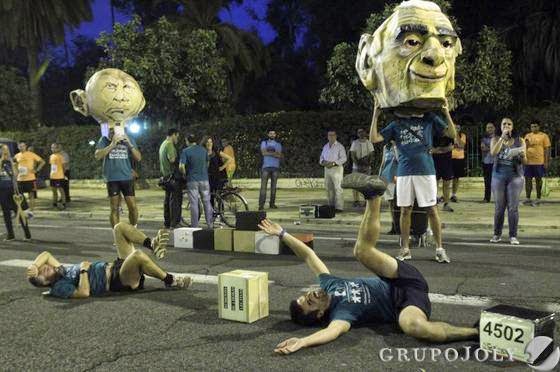 Marea Verde junto con los compañeros/as de Interinos Andaluces estuvieron denunciando en la Carrera Nocturna por el Guadalquivir la precaria situación de la educación pública en Andalucía. Se realizaron dos performances antes del comienzo de la carrera donde los cabezudos de la deseducación: Wert y Alonso ponían obstáculos a los animados/as corredores/as que caían al suelo ante tanta adversidad: recortes, aumento de horas, eliminación de 4.502 plazas, plan de calidad, aumento de ratios,….pero finalmente la marea se imponía y renacía para acabar con estos enemigos de la pública.